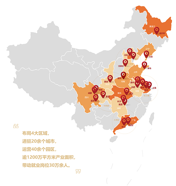 為促進某產業發展而創立的特殊區域環境,面積從十幾萬平方米到數十萬平方米,可涵蓋多種功能區,包含組合型園區和單一類型園區。億達中國根據項目要求,制定產業發展定位,提供施工、建設、招商運營、物業管理等全程服務,聚集復合型或特定產業客戶。